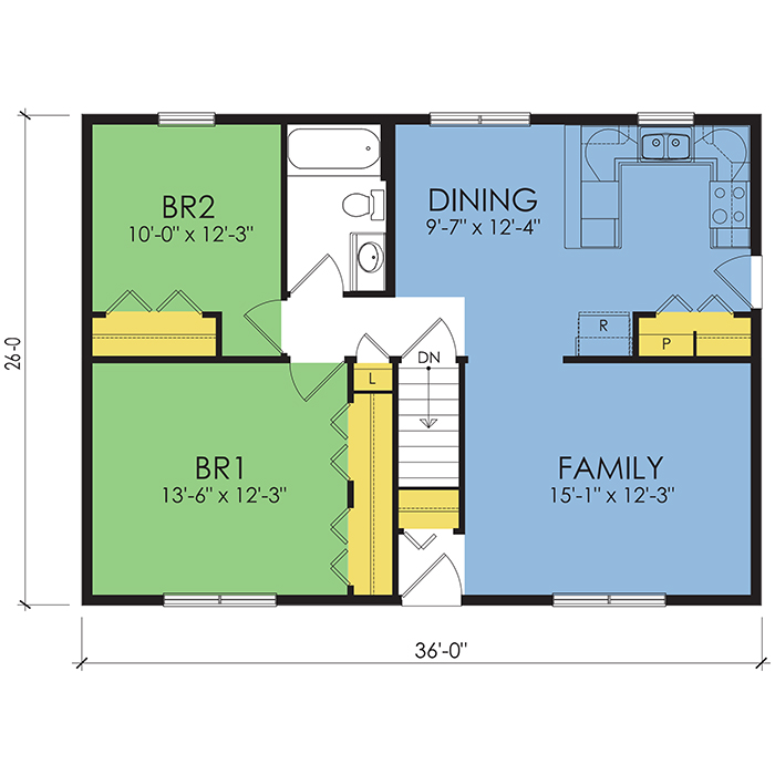 A part of our Wausau Originals, the Haywood floor plan features 2 bedrooms and 1 bathroom with a foot print of 36x26 feet and 936 total square feet of living space. Floor Plan #WO102